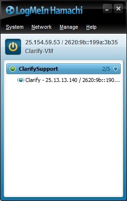 Once this is all done I will be able to login remotely to work on your PC. Once I have completed the work, You can open the Hamachi program, Right click on the "ClarifySupport" network and select "Go Offline". This will disconnect you from the Hamachi VPN network so nobody including me can access your systm.